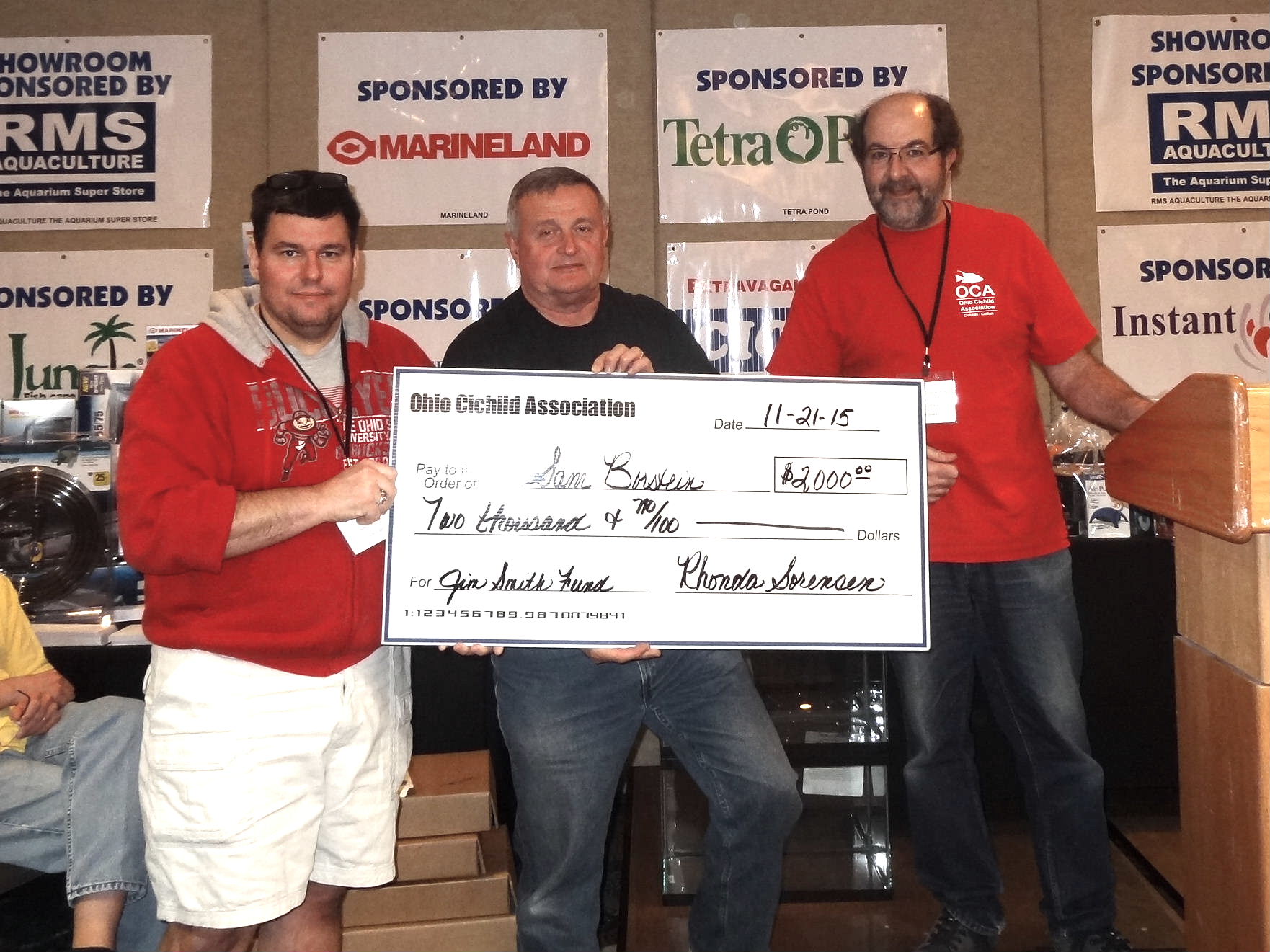 In 2011, the Jim Smith Fund donated $2,500 to Jay Stauffer at Penn State Universtiy. Due to the support from the OCA and it's members Dr. Stauffer and his assistants were able to type and catelog over 3,200 collections of Cichilds amounting to over 52,000 specimens. Those cateloged specimens are now available to Cichlid researchers worldwide!! Shown L to R are: OCA Vice-President, Dan Woodland, Ad Konings, and OCA President, Don Danko. Click here for more details on the Penn State Project »